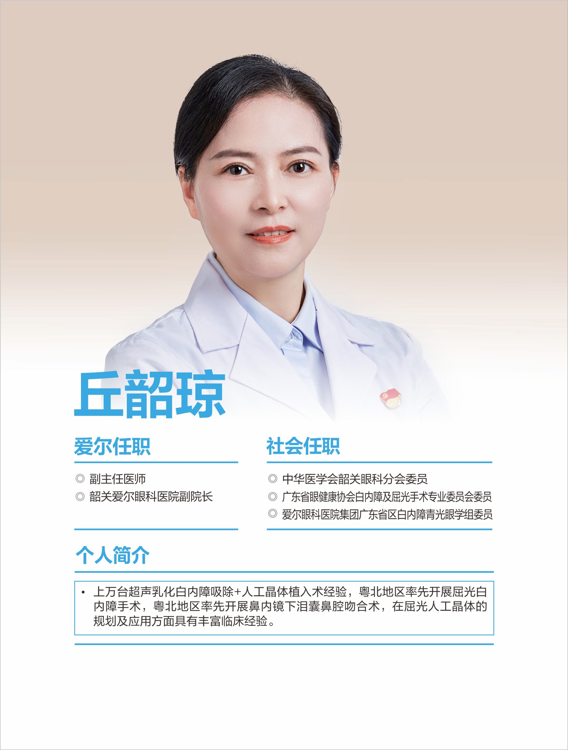 韶關(guān)愛爾眼科醫(yī)院有限公司白內(nèi)障團(tuán)隊(duì)擁王愛琴院長(zhǎng)(愛爾眼科粵北區(qū))、丘韶瓊院長(zhǎng)、郭俊豪主任等多位專科醫(yī)生,具備同步國(guó)際的白內(nèi)障手術(shù)能力,能熟練開展各項(xiàng)常規(guī)及疑難白內(nèi)障手術(shù)。 可開展微切口煥晶白內(nèi)障手術(shù),植入多焦晶體或多焦+散光矯正晶體,在治療白內(nèi)障同時(shí)同步解決遠(yuǎn)視/近視、老花眼、角膜散光等屈光問題,醫(yī)生手術(shù)經(jīng)驗(yàn)豐富,為眾多患者帶來(lái)更舒適的視覺。